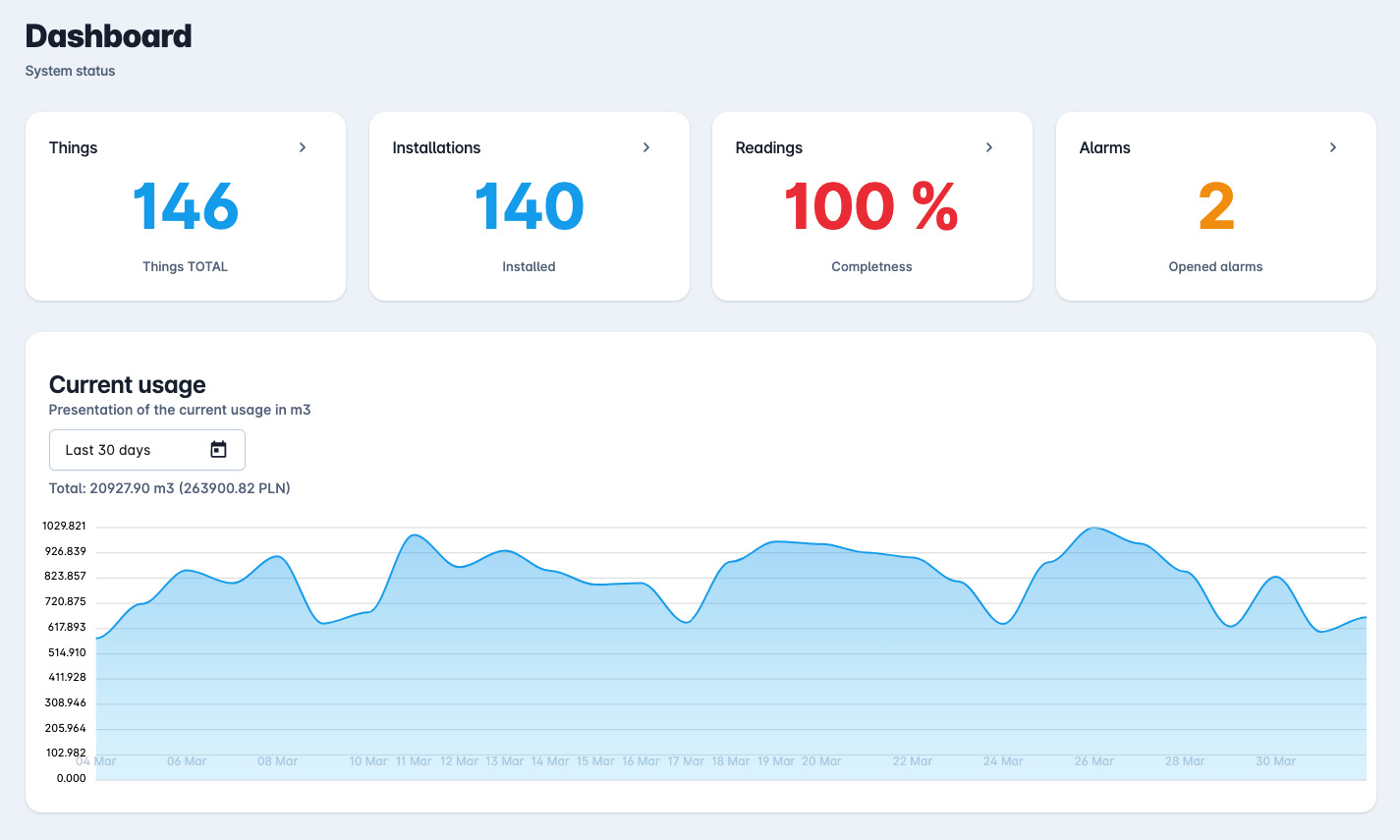 After logging in to the application, the user gains access to all data generated by the water meter. The reading is taken every hour. Thanks to this, you can observe current and historical water consumption. This data can be transferred directly to billing systems.